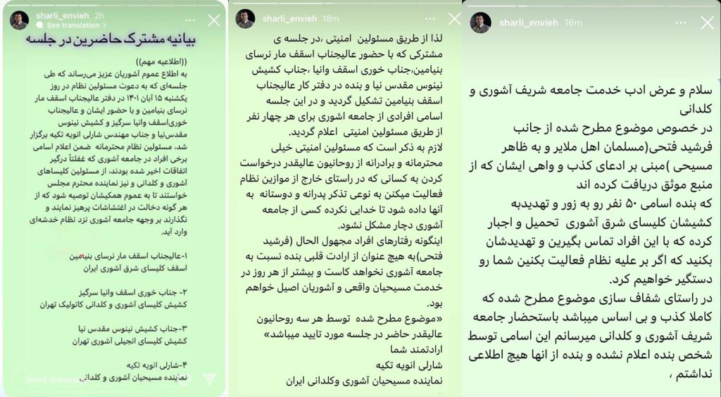 And after an Iranian Christian former prisoner of conscience, Farshid Fathi, lambasted the Assyrian MP and church leaders in an Instagram post, the MP, Sharli Envieh, responded angrily on his own Instagram account, while in so doing confirming the veracity of the claims.