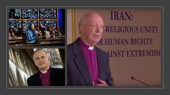 The former Archbishop of Wales, Barry Morgan (bottom left), and former bishop of Oxford, John Pritchard (right), have been among the leading Anglican figures to endorse the NCRI, led by Maryam Rajavi (top left). (Photo: MEK)