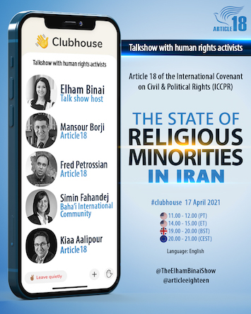 The discussion, set up and hosted by broadcaster Elham Binai, featured three Article18 representatives, Bahai International Community’s Simin Fahandej, and Marjan Keypour from the Alliance for Rights of All Minorities (ARAM).